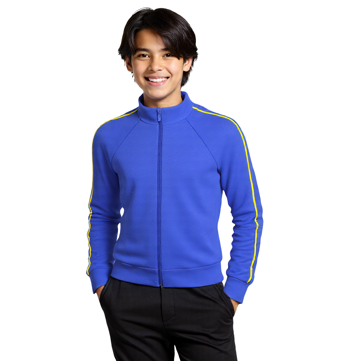 Helanca sem flanela. Mais resistente e muito mais confortável que Tactel. Gola um pouco mais alta para proteger o pescoço da friagem. Possui friso amarelo em ambas as mangas. Zíper frontal para vestir e tirar facilmente.