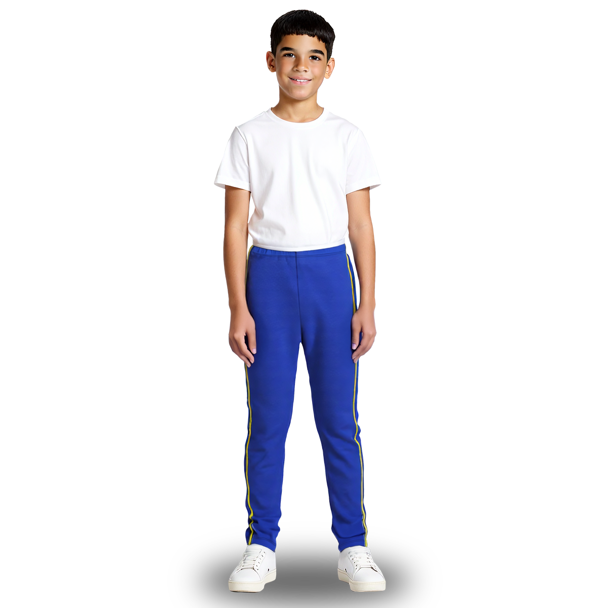 Helanca sem flanela unissex, mais resistente que Tactel e muito mais confortável, cintura com elástico, friso amarelo na lateral. Ótimo caimento, ideal para o uso tanto no verão, quanto no inverno. Usando como uniforme escolar.
