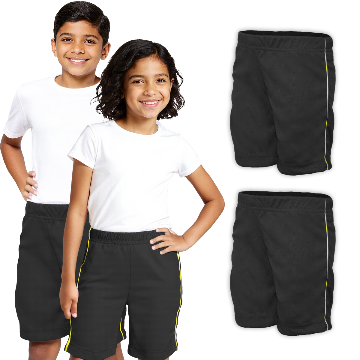 Bermuda de helanca unissex, tecido muito mais confortável e resistente que Tactel. Cintura com elástico, friso amarelo na lateral. Muito fácil de lavar, ideal para o uso no dia a dia ou como uniforme escolar.