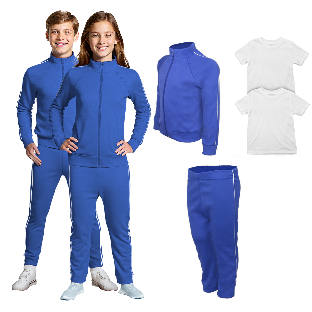 Contém: 1 Blusa de Helanca Juvenil, 1 Calça de Helanca Juvenil e 2 Camisetas manga curta brancas em tecido 100% poliéster.