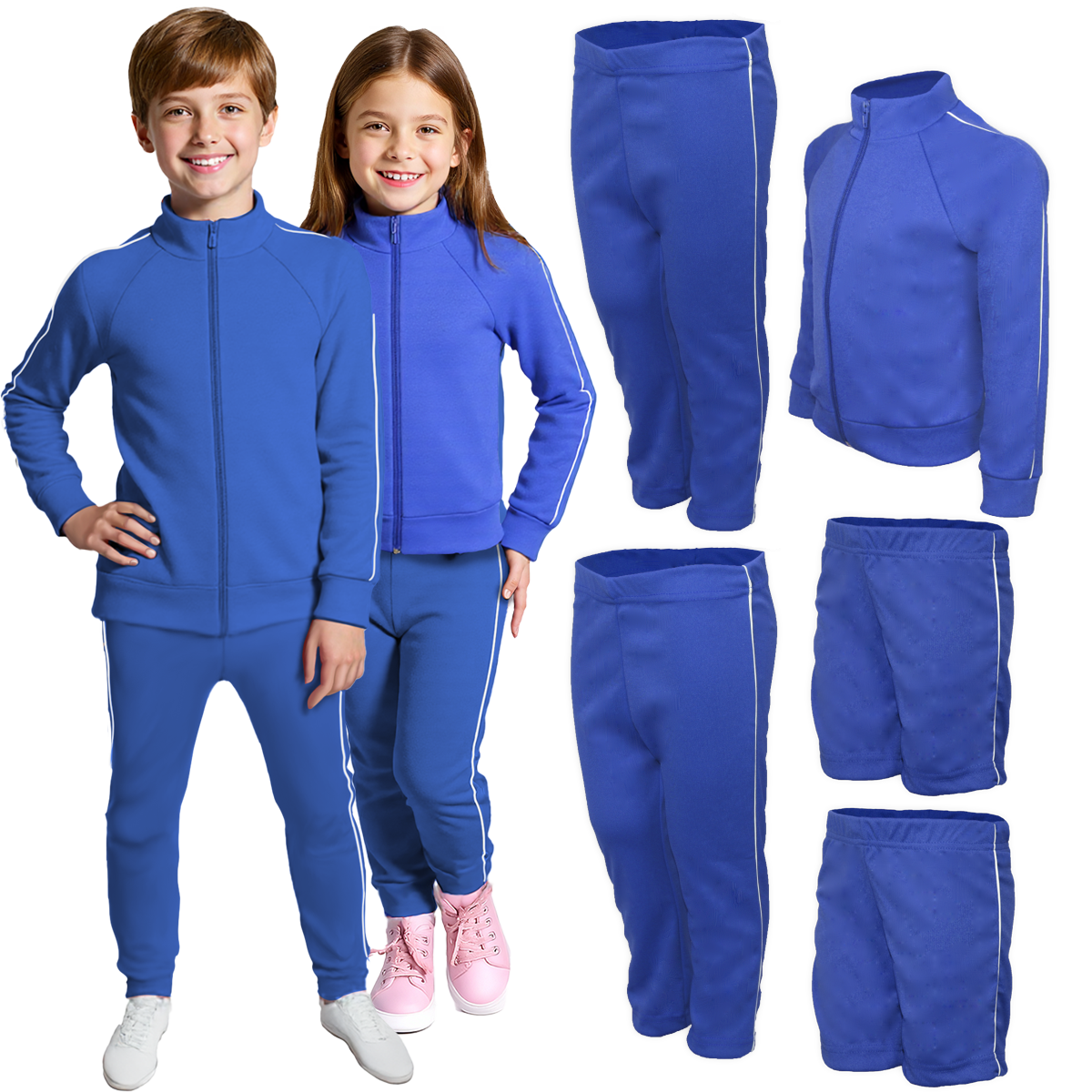 2 Calças de Helanca Infantil: Com cós elástico e friso branco na lateral, garantindo um ótimo caimento e liberdade de movimento.